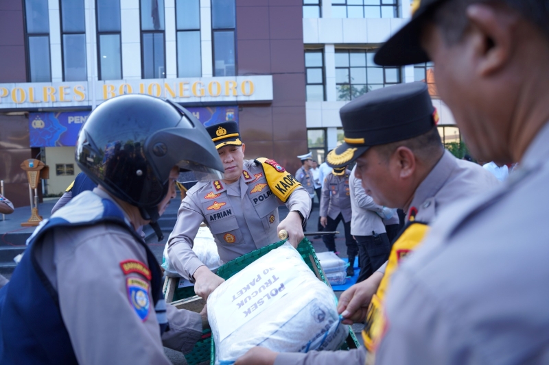 JATIMPOS.CO/BOJONEGORO — Polres Bojonegoro membagikan zakat fitrah kepada masyarakat menjelang Hari Raya Idulfitri 1447 Hijriah, Senin (16/3/2026).