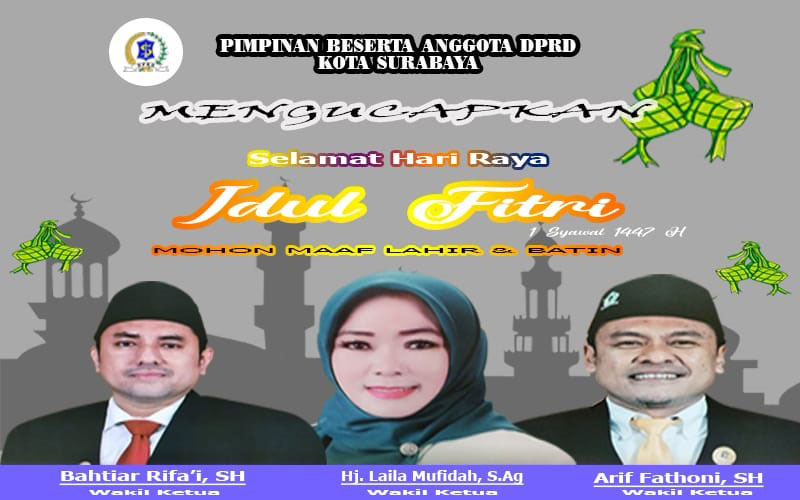 PIMPINAN beserta anggota Dewan Perwakilan Rakyat Daerah (DPRD) Kota Surabaya Mengucapkan Selamat Hari Raya Idul Fitri 1 Syawal 1447 Hijriyah/2026, Mohon Maaf Lahir dan Batin. (ikl/adv)