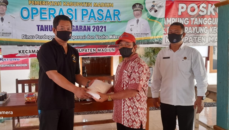 JATIMPOS.CO/KABUPATEN MADIUN - Dinas Perdagangan, Koperasi dan Usaha Mikro (Disperdagkop dan UM) Kabupaten Madiun menggelar operasi pasar berupa bahan pokok di Desa Mojorayung, Kecamatan Wungu, Kabupaten Madiun, Rabu (10/11/2021).