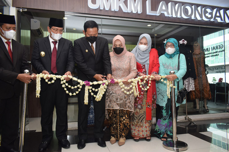 JATIMPOS.CO/LAMONGAN - Bertepatan dengan moment Peringatan Hari Pahlawan tahun 2021, Bupati Lamongan Yuhronur Efendi secara resmi melaunching Gerai Usaha Mikro, Kecil, dan Menengah (UMKM) Dharma Wanita Persatuan Kabupaten Lamongan.