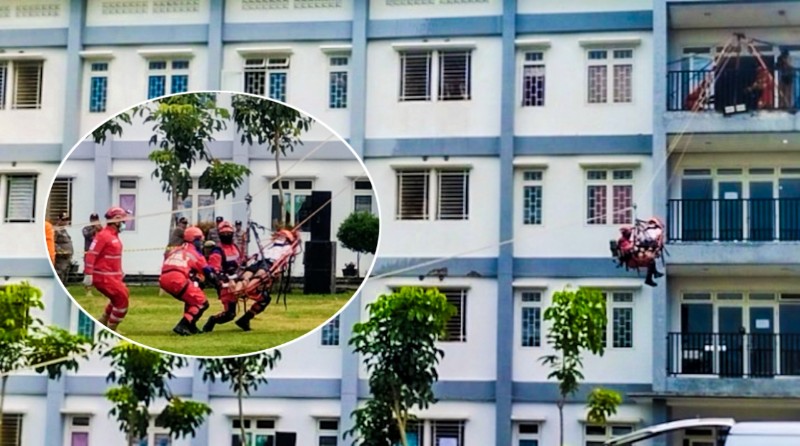 Dalam simulasi itu, tim gabungan memperagakan evakuasi korban dari lantai atas menggunakan teknik tali, pengamanan tubuh, hingga koordinasi tim darat. Setiap gerakan tampak terukur, mulai dari pengikatan, penurunan, hingga penanganan korban di bawah.