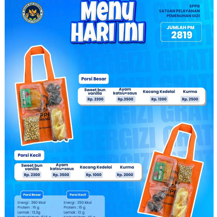 Sementara untuk porsi kecil, menu yang disajikan meliputi Sweet Bun Vanilla Rp2.300, Ayam Katsu Saus Rp3.500, Kacang Kedelai Rp1.000, dan Kurma Rp2.000 dengan total kandungan gizi sekitar energi 350 kkal, protein 15 gram, lemak 12 gram, karbohidrat 46 gram, serta serat 2,5 gram.