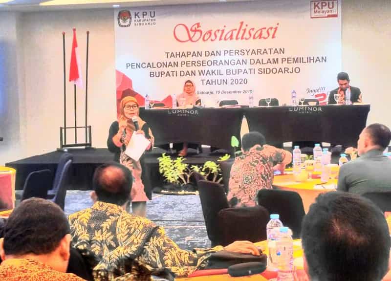 JATIMPOS.CO/SIDOARJO - Komisi Pemilihan Umum (KPU) Kabupaten Sidoarjo menggelar sosialisasi tahapan dan persyaratan pencalonan perseorangan dalam pemilihan Bupati dan Wakil Bupati Sidoarjo Tahun 2020 di Hotel Luminor Sidoarjo, Kamis (19/12/2019).