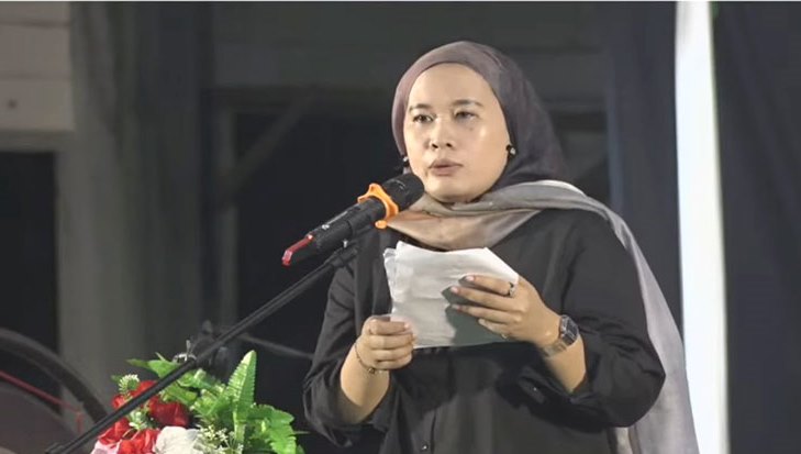 Ibu Lesli Citra Pertiwi, pejabat pada Bidang Kebudayaan Disbudpar Jatim menyampaikan pesan Kadisbudpar Jatim pada pembukaan wayang kulit di halaman pesantren Al-Bukhori Mangunan, Sampung Ponorogo (14/11/2025)