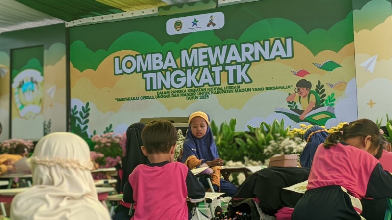 JATIMPOS.CO/KABUPATEN MADIUN – Suasana riang terdengar sejak pagi di halaman Dinas Perpustakaan dan Kearsipan Kabupaten Madiun, Selasa (18/11/2025). Deretan meja kecil, kertas gambar, dan set krayon warna-warni menjadi pusat perhatian puluhan anak taman kanak-kanak yang mengikuti Lomba Mewarnai. Kegiatan ini menjadi pembuka rangkaian Festival Literasi 2025 yang digelar selama tiga hari, 18–20 November 2025.