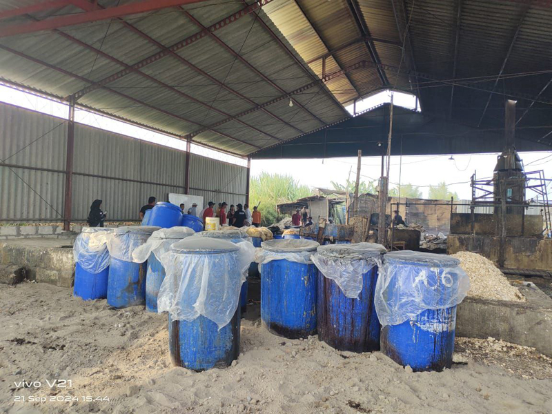 Heri menjelaskan proses pengolahan limbah telur yang dilakukan, di mana telur dihancurkan, cangkangnya dipilah, dan cairannya dimasak sebelum diberikan sebagai pakan lele.