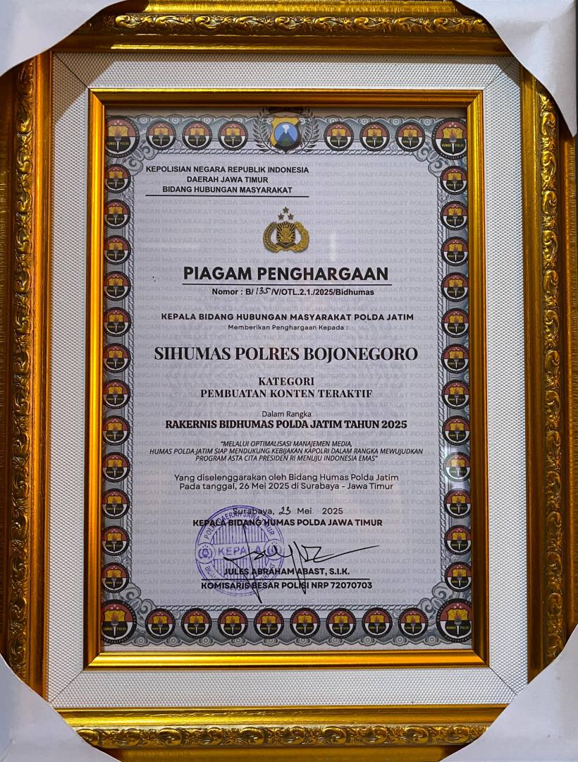 Piagam penghargaan tersebut diterima langsung oleh Kepala Seksi Humas (Kasi Humas) Polres Bojonegoro, AKP Karyoto, di Gedung Mahameru Polda Jatim, Surabaya, pada Senin (26/5/2025). Acara ini dihadiri oleh Kapolda Jatim, Wakapolda, para PJU Polda Jatim dan Kasi Humas Polres jajaran se-Jawa Timur sebagai bentuk evaluasi dan penguatan strategi komunikasi publik Polri.