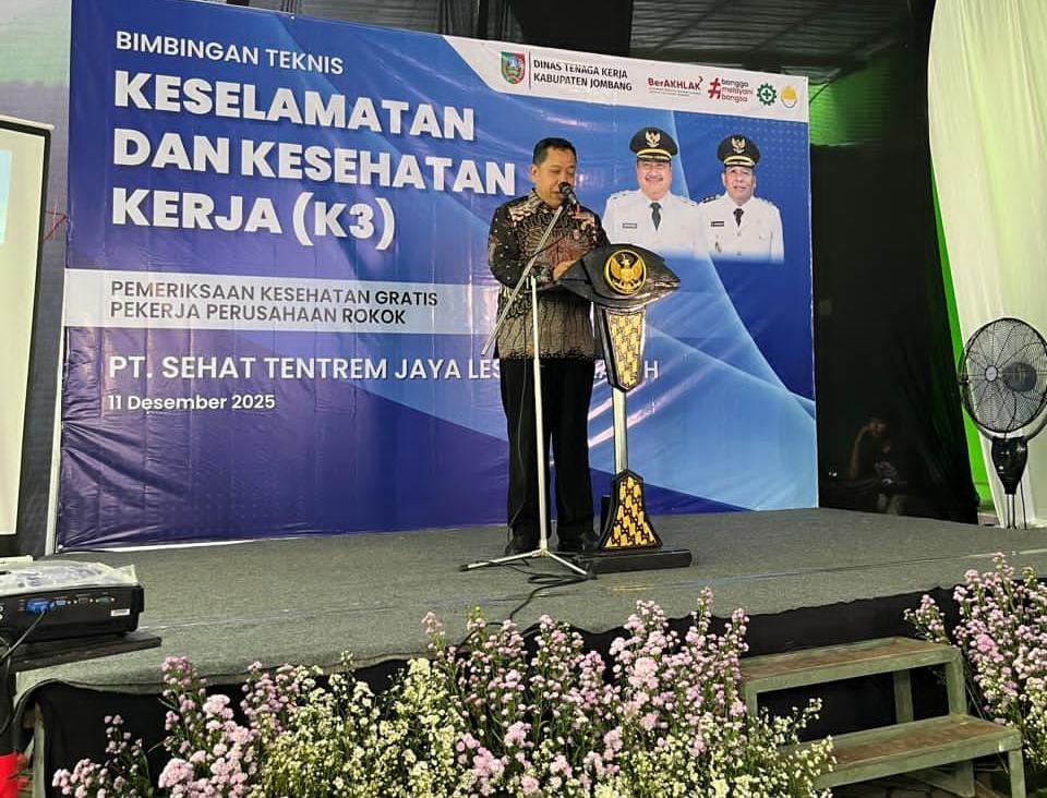 JATIMPOS.CO/JOMBANG - Dinas Tenaga Kerja (Disnaker) Jombang menggelar Bimbingan Teknis (Bimtek) Keselamatan dan Kesehatan Kerja (K3) serta pemeriksaan kesehatan gratis bagi pekerja industri rokok PT Sehat Tentrem Jaya Lestari (STJL), pada Kamis (11/12/2025).