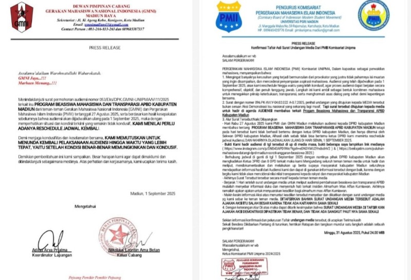 JATIMPOS.CO/KABUPATEN MADIUN – Dua organisasi mahasiswa di Madiun, Pergerakan Mahasiswa Islam Indonesia (PMII) Komisariat Universitas PGRI Madiun (Unipma) dan Gerakan Mahasiswa Nasional Indonesia (GMNI) Cabang Madiun, memutuskan menunda agenda audiensi dengan DPRD Kabupaten Madiun yang semula dijadwalkan berlangsung Senin, 1 September 2025.