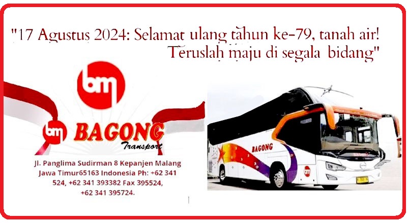 PIMPINAN beserta Seluruh Staf BM Bagong Transport Jl. Panglima Sudirman 8 Kepanjen Malang Jawa Timur, Ph : +62-341524, +62 341 393382 Fax 395524 + 62 341 395724 Mengucapkan : “17 Agustus 2024 : Selamat ulang taun ke-79, tanah air! Teruslah maju di segala bidang”