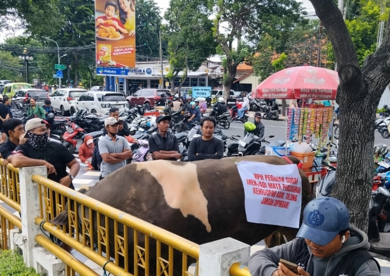 JATIMPOS.CO/SURABAYA — Ratusan anggota Paguyuban Jagal dan Pedagang Daging Rumah Potong Hewan (RPH) Pegirian menggelar aksi unjuk rasa di depan Gedung DPRD Kota Surabaya, Senin (12/1/2026).