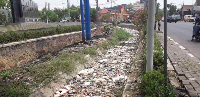 JATIMPOS.CO/SIDOARJO - Pemandangan kurang elok tampak di antara sungai jalan perempatan Kecamatan Wonoayu Kabupaten Sidoarjo. Tepat di depan Pabrik Besar PT SMC terlihat tumpukan sampah memenuhi got.