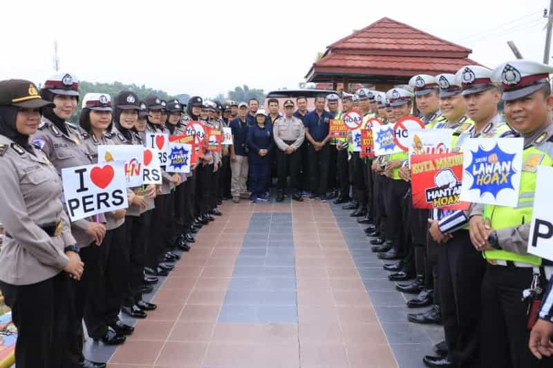 lam acara tersebut pihak Polres Madiun Kota juga memberikan dukungan penuh dengan menerjunkan dua pleton pasukan anti hoax, terdiri satu pleton anggota Polwan dan satu pleton anggota Satlantas.
