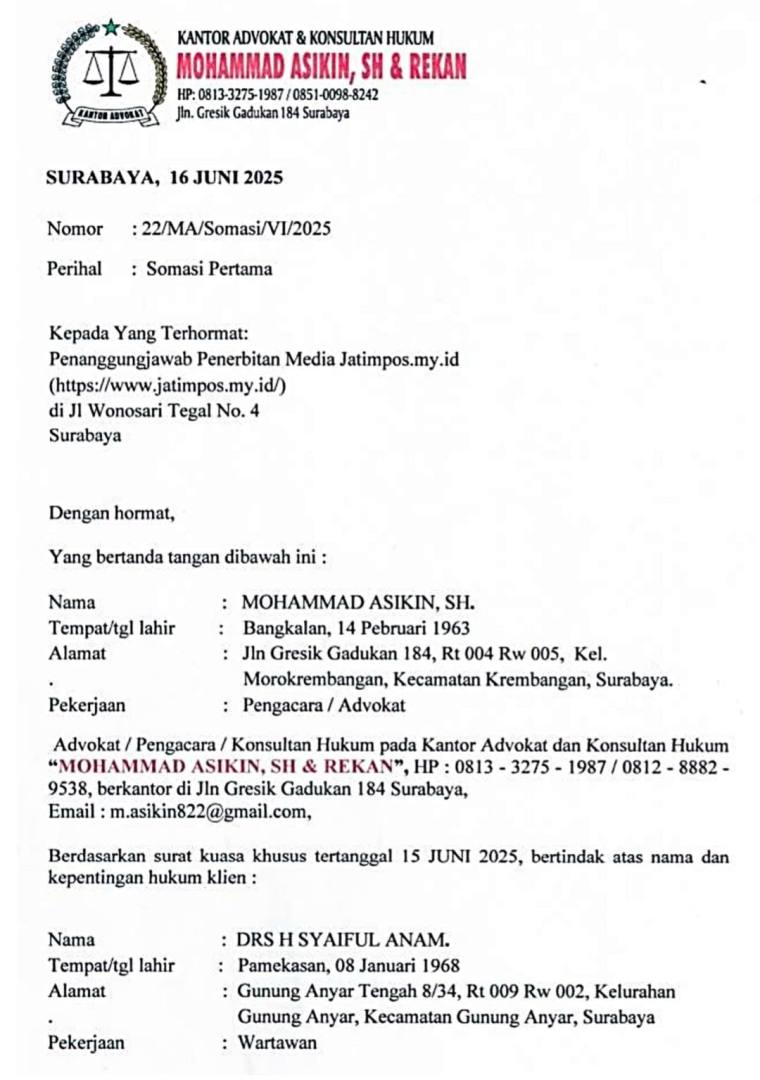 Heru menyampaikan, “Berkenan diketahui, redaksi kami Jatimpos.co pada 16 Juni 2025 lalu telah melayangkan surat somasi oleh tim lawyer Mohammad Asikin, SH & rekan kepada penanggung jawab media jatimpos.my.id yang beralamat di Jl Wonosari Tegal No. 4 Surabaya. Bahwa dalam surat somasi kami tersebut, Pimpred Jatimpos.co Drs H Saiful Anam merasa dirugikan atas penggunaan nama media yang sama. Karena Tabloid dan Media Online Jatimpos.co memiliki hak patent nama "JATIMPOS" sebagaimana tertuang dalam sertifikat Nomor (250) Merek Indonesia (111) IDM000002986, yang dikeluarkan Kementerian Hukum dan HAM RI. Berlaku hingga 21 April 2033,” terangnya sebagaimana disampaikan oleh Pimpinan redaksi Jatimpos.co yang tertuang dalam surat somasi.
