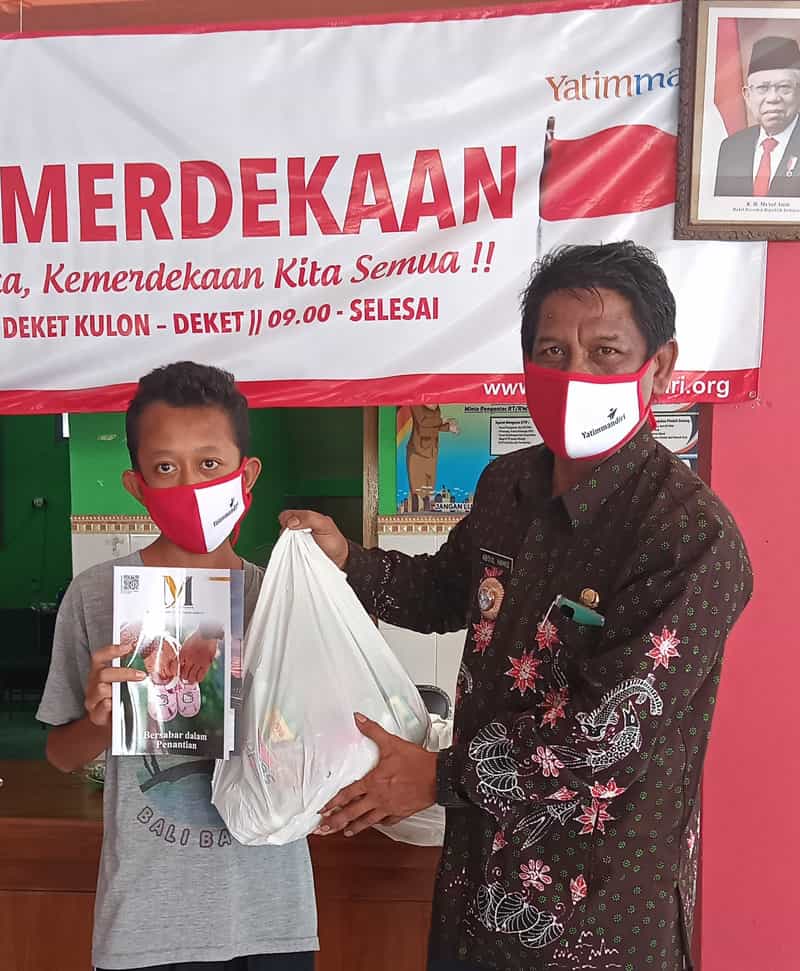 Kepala Yatim Mandiri cabang Lamongan Mustain mengatakan pembagian paket sembako merdeka di samping untuk menyemarakkan HUT RI sekaligus berbagi kebahagiaan adik yatim dhuafa serta upaya meringankan beban masyarakat fakir miskin ditengah pandemi Covid-19.