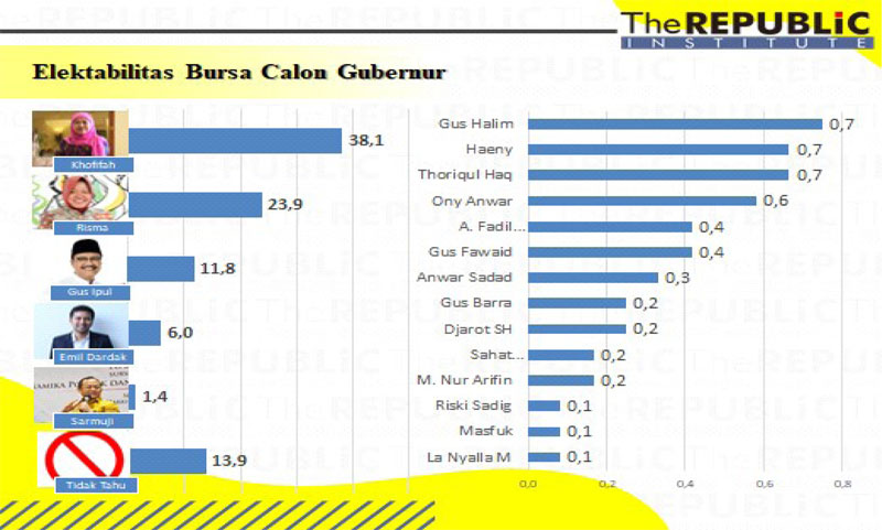 Sementara itu untuk tingkat keterpilihannya (elektabilitasnya) bagi aktor-aktor politik potensial di Jawa Timur yang berpeluang ikut dalam kontestasi dalam pemilihan Gubernur mendatang apabila pilihannya sekarang maka hasil yang didapatkan sebagai berikut: Khofifah (38,1%), Tri Risma (23,9%), Gus Ipul (11,8%), Emil Dardak (6,0%), Sarmuji (1,4%), Gus Halim (0,7%), Ony Anwar (0,7%), Haeny Relawati (0,7%), Thoriqul Haq (0,7%), Muhammad Fawaid (0,4%), Fadil Muzakki (0,4%), Anwar Sadad (0,3%), Sahat Simanjutak (0,2%), Gus Barra (0,2%), Djarot S. Hidayat (0,2%), M. Nur Arifin (0,2%), La Nyalla (0,1%), dan yang belum menentukan (13,9%).