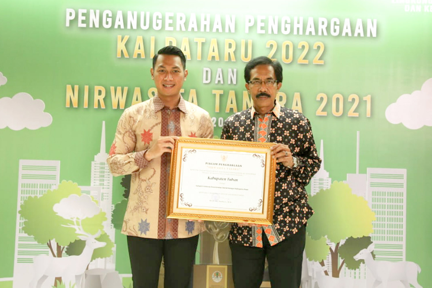 JATIMPOS.CO/TUBAN - Bupati Tuban, Aditya Halindra Faridzky menerima penghargaan Nirwasita Tantra 2021 di Auditorium Dr. Ir. Soejarwo, Gedung Manggala Wana Bakti, Jakarta, Rabu (20/7). Wakil Menteri Lingkungan Hidup dan Kehutanan (KLHK) RI, Dr. Alue Dohong, PhD menyerahkan langsung penghargaan terbaik IV kriteria pemerintah daerah kategori kabupaten besar.