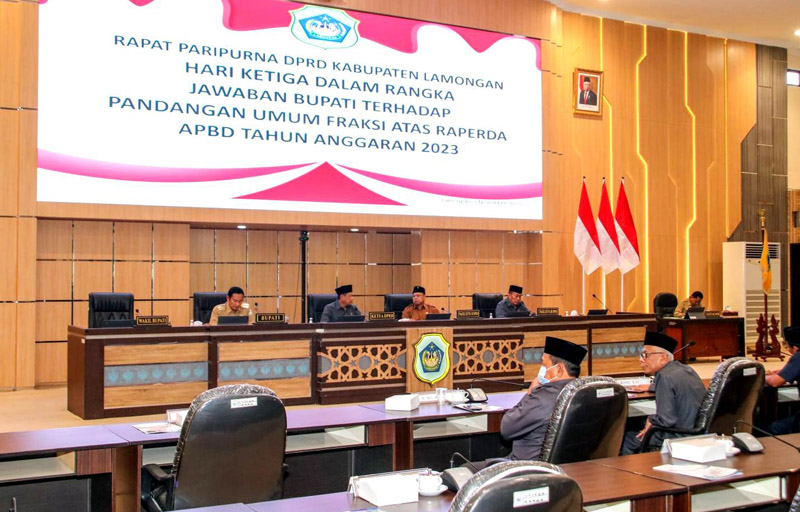JATIMPOS.CO/LAMONGAN - Bupati Lamongan Yuhronur Efendi menyampaikan Jawaban Eksekutif atas Pandangan Umum Fraksi DPRD terhadap rancangan APBD Kabupaten Lamongan Tahun Anggaran 2023.