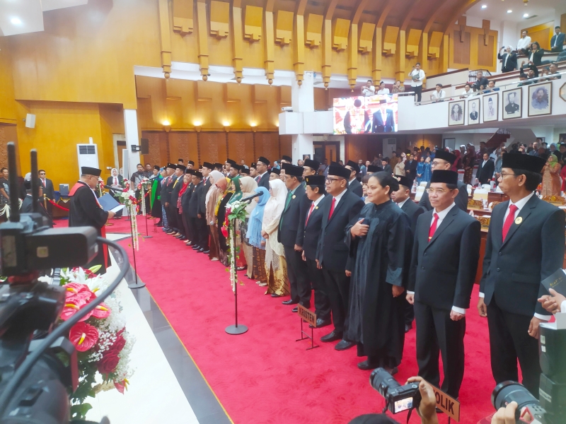 Ketua Pengadilan Negeri Kota Surabaya kelas 1A Khusus, Dadi Rachmadi SH. MH. yang memandu pengucapan sumpah dan janji para anggota Dewan terpilih berdasar pada isi Surat Keputusan Gubernur Jawa Timur Pj. Adhy Karyono Nomor 100.3.3.1/741/KPPS/011:/2024 Tanggal 9 Agustus 2024 tentang Peresmian Pengangkatan anggota Dewan Perwakilan Rakyat Daerah Kota Surabaya masa jabatan tahun 2024-2029.