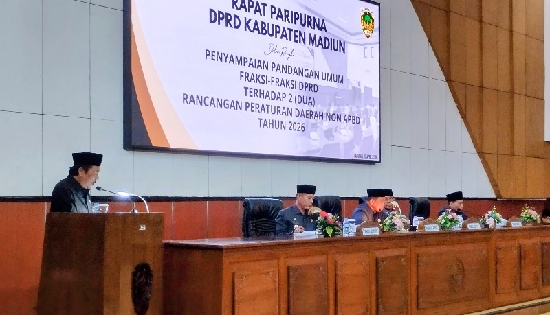 JATIMPOS.CO/KABUPATEN MADIUN — DPRD Kabupaten Madiun menggelar rapat paripurna dengan agenda penyampaian pandangan umum fraksi-fraksi terhadap dua Rancangan Peraturan Daerah (Raperda) non-APBD Tahun 2026, Senin (13/4/2026).
