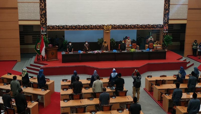 JATIMPOS.CO/KABUPATEN MOJOKERTO - Dewan Perwakilan Rakyat Daerah (DPRD) Kabupaten Mojokerto menggelar Rapat Paripurna dengan Agenda Penyampaian Nota Penjelasan Bupati Mojokerto terhadap Raperda APBD TA 2022 di Gedung Graha Whicesa DPRD Kabupaten Mojokerto, Kamis (4/10/2020).