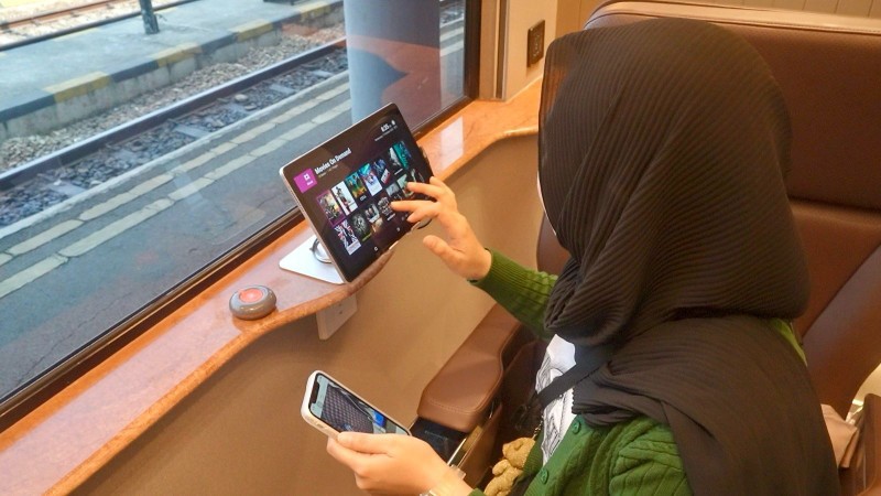Di sisi dekat jendela terdapat Train Onboard Infotainment System berisi aneka film populer, musik dengan berbagai genre, hingga kanal televisi nasional yang bisa dinikmati sepanjang perjalanan. Pelanggan juga dimanjakan dengan layanan makanan berupa hidangan pembuka, hidangan utama, hidangan penutup, serta aneka minuman dan berbagai layanan spesial lainnya.