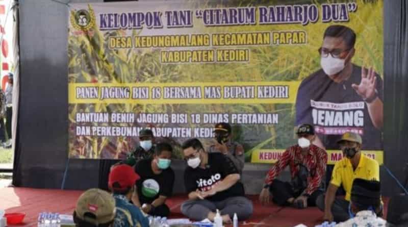 JATIMPOS.CO/KEDIRI - Bupati Kediri Hanindhito Himawan Pramana bersama warga Desa Kedungmalang melakukan panen raya jagung di lahan pertanian Desa Kedungmalang, Kecamatan Papar, Kabupaten Kediri, Kamis (18/03/2021).