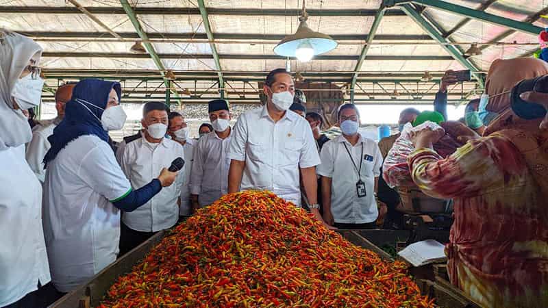 JATIMPOS.CO/SURABAYA - Menteri Perdagangan (Mendag) Muhammad Lutfi mengunjungi Pasar Induk di Osowilangon (PIOS). Didampingi Wali Kota Surabaya Eri Cahyadi dan Wakil Gubernur Jawa Timur Emil Dardak. Dalam kunjungannya tersebut, Menteri Perdagangan ingin memastikan harga dan pasokan sembako selama bulan suci Ramadhan di Kota Pahlawan aman dan stabil.