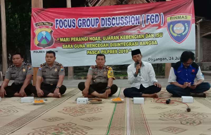 “ FGD ini digelar, dalam rangka memerangi hoax, ujaran kebencian dan isu sara guna mencegah disintregitas bangsa pasca Pilpres 2019, " jelas Kasat Binmas Polres Madiun, AKP Sigit Siswadi.