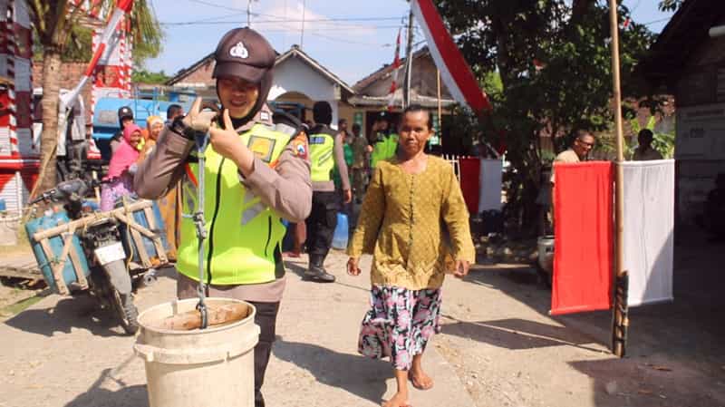 Banyak anggota polwan membantu mengisikan air bersih itu ke ember-ember milik ibu-ibu lanjut usia warga dusun tersebut hingga membawakan airnya sampai ke rumah.