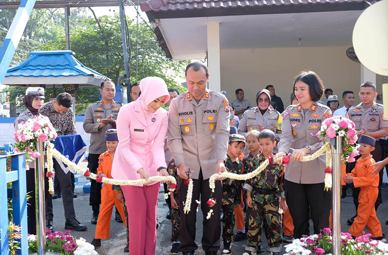 JATIMPOS.CO/KABUPATEN MALANG - Kapolres Malang AKBP Putu Kholis Aryana didampingi Ketua Bhayangkari Cabang Malang Ny Ujik Putu Kholis, meresmikan sarana edukasi Taman Lalu lintas yang diberi nama Budhi Luhur Bhayangkara, yang berada di lingkungan kantor Satpas (Pelayanan SIM) Singosari, Polres Malang, pada Sabtu (24/6/2023).