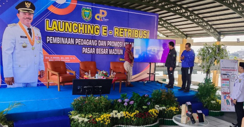 JATIMPOS.CO/KOTA MADIUN - Wali Kota Madiun, Maidi melaunching e-retribusi pelayanan pasar di hall kolam renang, lantai 3, Pasar Besar Madiun (PBM), Rabu (24/5/2023).