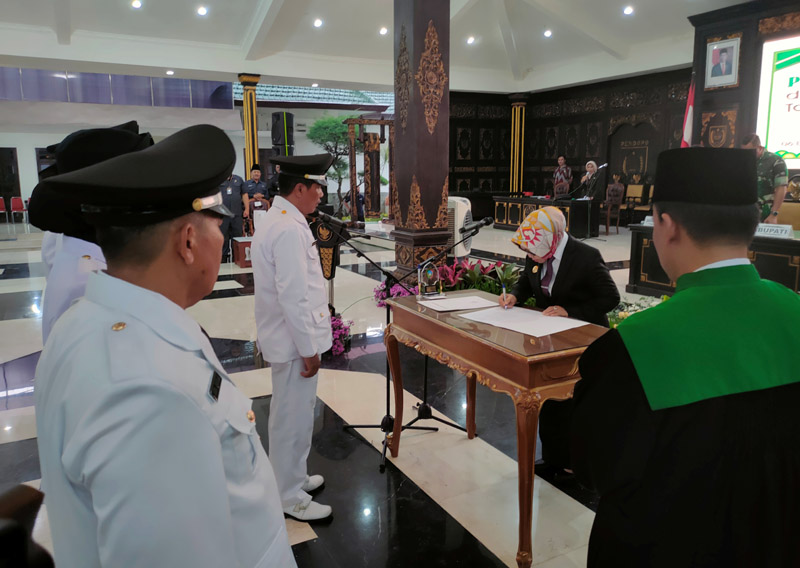 JATIMPOS.CO/JOMBANG - Bupati Jombang Hj Mundjidah Wahab resmi melantik 7 Kepala Desa dari 6 kecamatan terpilih masa Jabatan 2022-2028, di pendopo Kabupaten Jombang, Selasa (6/12/2022).