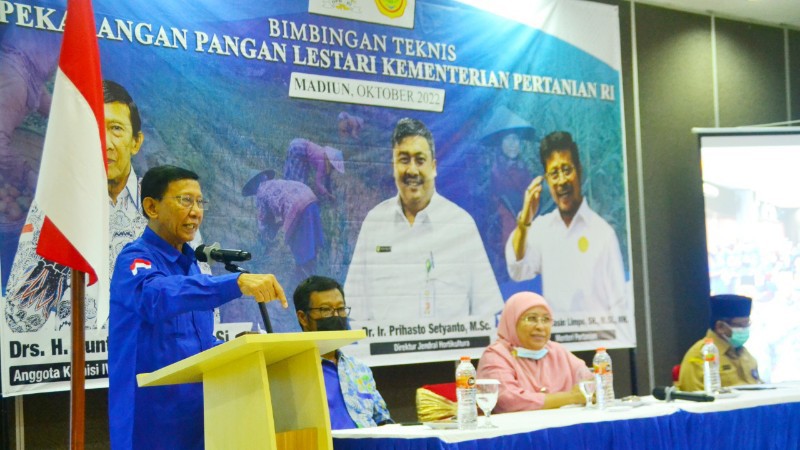 JATIMPOS.CO/KOTA MADIUN - Anggota Komisi IV DPR RI Fraksi Partai Demokrat, Drs. H. Guntur Sasono, M.Si berkolaborasi dengan Kementerian Pertanian Republik Indonesia (RI) menggelar Bimbingan Teknis (Bimtek) Pekarangan Pangan Lestari (P2L) di Hotel Setia Budi Kota Madiun, Selasa (18/10/2022).