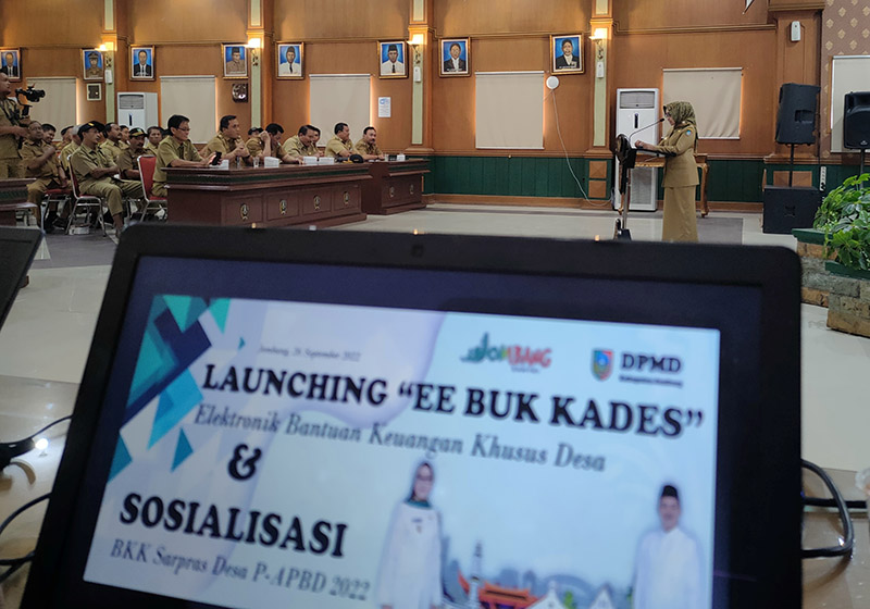 JATIMPOS.CO/JOMBANG - Pemerintah Kabupaten Jombang melalui Dinas Pemberdayaan Masyarakat dan Desa (DPMD) Jombang meluncurkan aplikasi khusus BKK Sarpras Desa yang diberi nama "EE BUK KADES" yakni (Elektronik Bantuan Keuangan Khusus Desa) dalam rangka peningkatan kualitas perencanaan, pelaksanaan, pelaporan dan monitoring BKK Sarpras Desa, di ruang Bung Tomo – Pemkab Jombang, Senin (26/9/2022).