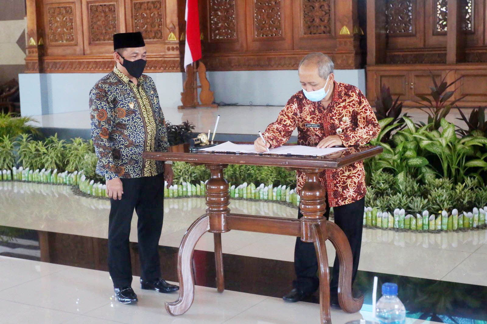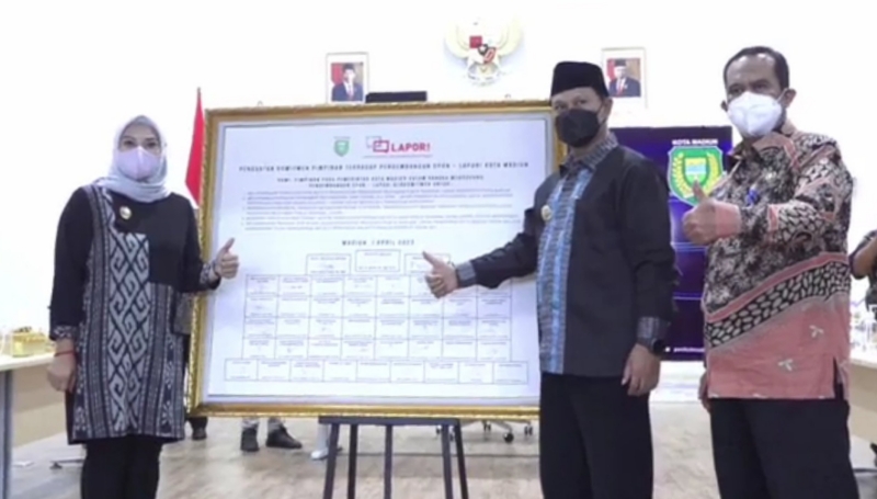 JATIMPOS.CO/KOTA MADIUN - Wali Kota Madiun, Maidi bersama Wakil Wali Kota Madiun, Inda Raya dan Sekda Kota Madiun, Soeko Dwi Handiarto melakukan penandatanganan komitmen bersama program pengembangan Sistem Pengelolaan Pengaduan Pelayanan Publik Nasional- Layanan Aspirasi dan Pengaduan Online Rakyat (SP4N - LAPOR!) di Kota Madiun.