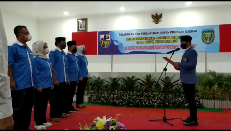 JATIMPOS.CO/KOTA MADIUN - Wakil Wali Kota Madiun, Inda Raya Ayu Miko Saputri dikukuhkan sebagai Ketua Komite Pemuda Nasional Indonesia (KNPI) Dewan Pimpinan Daerah (DPD) Kota Madiun, periode 2020 - 2023 di Gedung Diklat Kota Madiun, Rabu (23/2/2022).