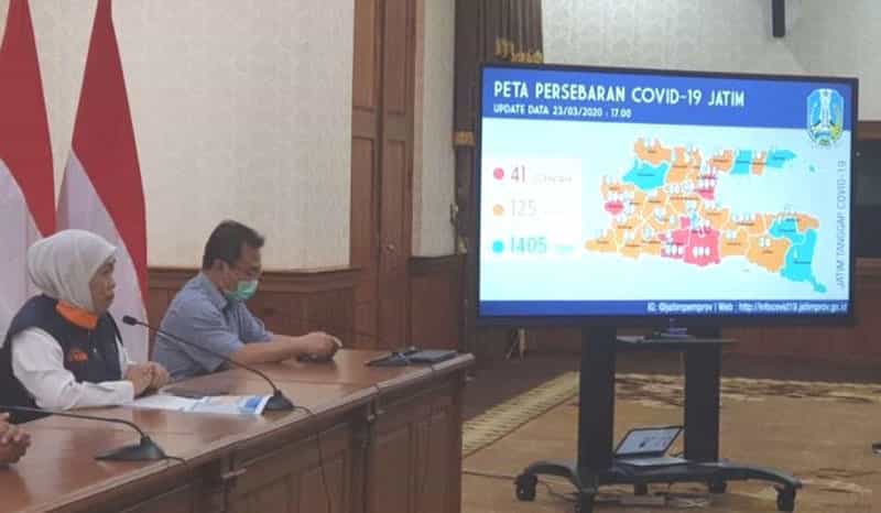 Gubernur Khofifah merilis perkembangan covid-19 di Jatim per hari ini (23/3). Menurutnya, warga Jatim yang positif Covid-19 tetap sebanyak 41 orang. Namun, lonjakan jumlah terjadi pada orang dalam pemantauan (ODP), yakni 1.405 orang dari sebeblumnya 999 orang.