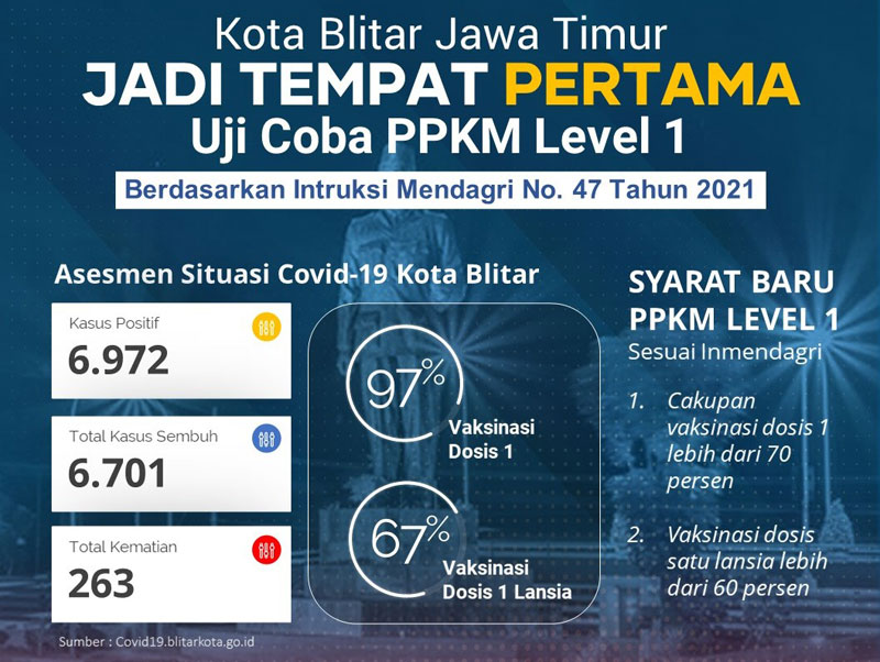 Implementasi uji coba level 1 di Kota Blitar dilakukan karena telah memenuhi syarat indikator Asesment Kemenkes untuk masuk level 1, ditambah dengan syarat baru dari Inmendagri no 47 yakni cakupan vaksinasi dosis 1 yang sudah lebih dari 70 persen dan dosis satu lansia lebih dari 60 persen.