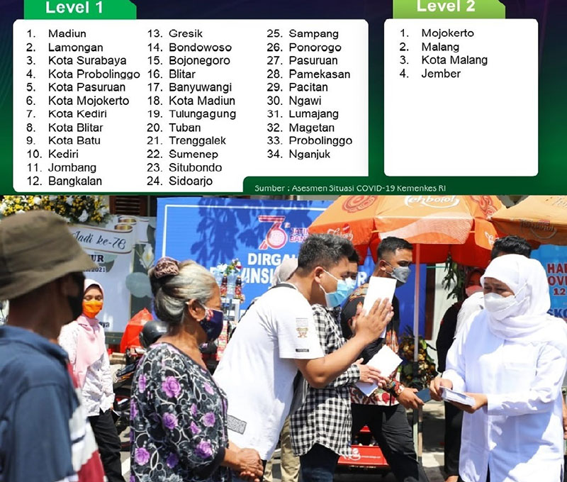 JATIMPOS.CO/SURABAYA - Alhamdulillah, berdasarkan hasil asesmen situasi Covid-19 dari Kemenkes per 13 Oktober 2021, ada 34 kabupaten/kota di Jawa Timur yang masuk pada Level 1. Sementara itu, situasi Covid-19 di empat daerah lainnya masih berada pada Level 2. Empat daerah yang dimaksud adalah Kabupaten Mojokerto, Kabupaten Malang, Kabupaten Jember, dan Kota Malang.