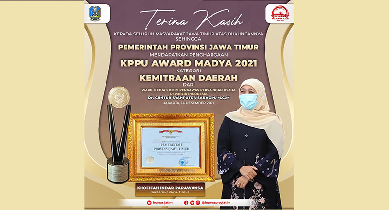 JATIMPOS.CO//SURABAYA- Dukungan iklim persaingan usaha yang sehat di Jawa Timur, Pemerintah Provinsi Jawa Timur mendapatkan penghargaan tingkat nasional dari Komisi Pengawas Persaingan Usaha (KPPU) Award 2021.