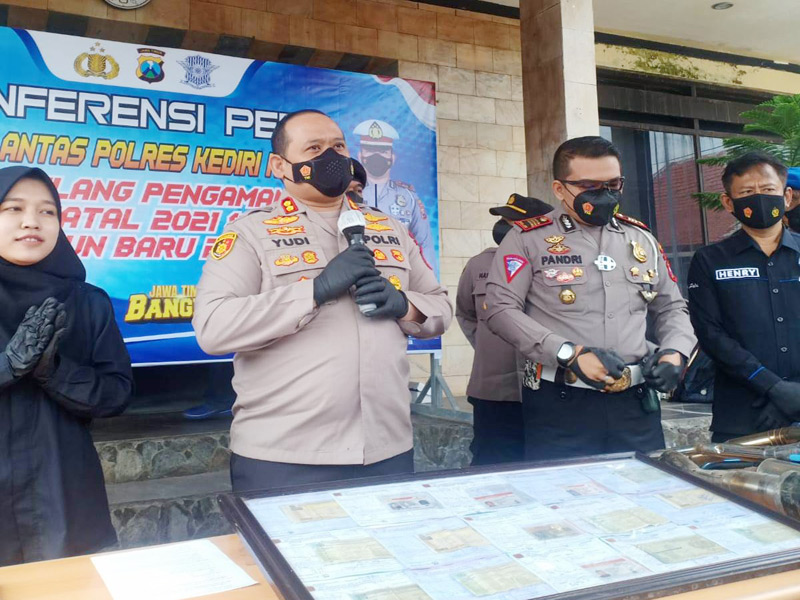 JATIMPOS.CO//KEDIRI- Satuan Lalu Lintas Kepolisian Resor Kediri Kota menggelar Konferensi Pers Menjelang Pengamanan Natal 2021 dan Tahun Baru 2022 dengan memajang 133 sepeda motor berknalpot borong dalam razia balap liar yang dilakukan di beberapa titik wilayah hukum Polres Kediri Kota, Senin (6/12) kemarin.