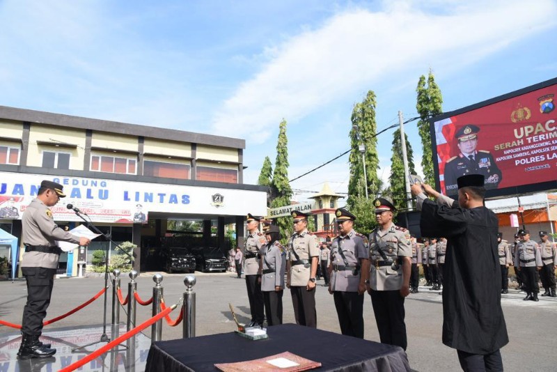 JATIMPOS.CO/LAMONGAN - Kapolres Lamongan AKBP Yakhob Silvana Delareskha S.I.K., M.Si memimpin langsung upacara serah terima jabatan (Sertijab) 5 Kapolsek baru.