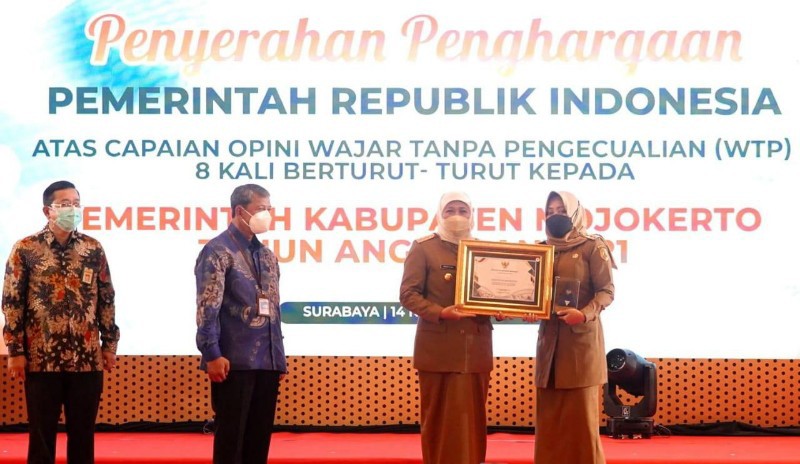Badan Pemeriksa Keuangan (BPK) RI memberikan predikat Wajar Tanpa Pengecualian (WTP) terhadap Laporan Keuangan Pemerintah Daerah (LKPD) Kabupaten Mojokerto tahun anggaran 2021.