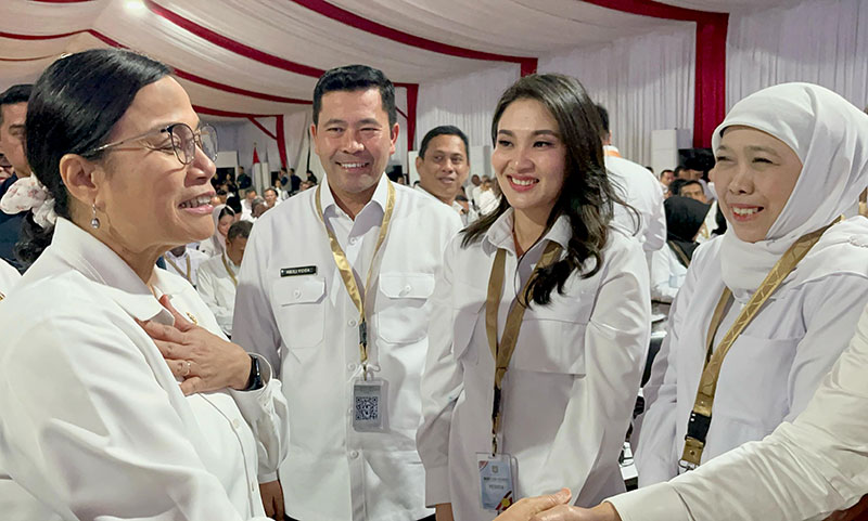 JATIMPOS.CO/SURABAYA- GUBERNUR Jawa Timur Khofifah Indar Parawansa dan Wakil Gubernur Emil Elestianto Dardak memasuki Gedung Negara Grahadi Surabaya, Minggu (2/3/2025) setelah melakukan serangkaian pelantikan di Istana Negara dan Retret di Magelang.
