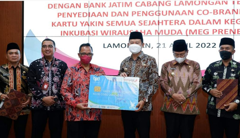 JATIMPOS.CO/LAMONGAN - Upaya menetaskan atmosfer kebangkitan Lamongan, Pemerintah Kabupaten (Pemkab) Lamongan melakukan penandatangan perjanjian kerjasama dengan Bank Jatim terkait peluncuran kartu Co-branding Yakin SEmua Sejahtera yang berlangsung di ruang Command Center Pemkab Lt.3. Kamis (21/4/2022).