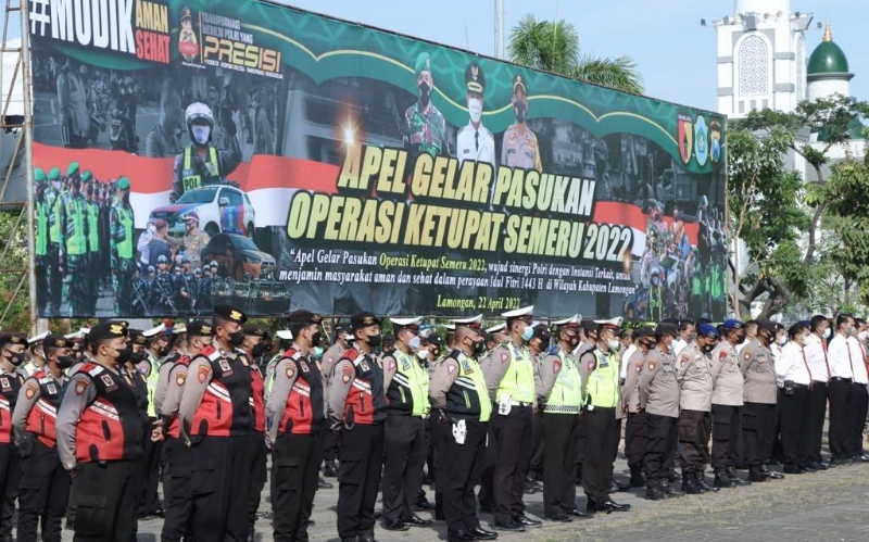 JATIMPOS.CO/LAMONGAN - Apel gelar pasukan operasi ketupat semeru 2022 serentak dilaksanakan di seluruh Indonesia, tidak terkecuali di Kabupaten Lamongan yang dilaksanakan di Alun-alun Kota Lamongan, Jumat (22/04/2022).