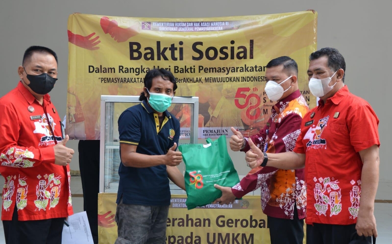 JATIMPOS.CO/LAMONGAN - Masih dalam rangkaian kegiatan Hari Bhakti Pemasyarakatan (HBP) ke-58 di lingkungan Kementerian Hukum dan Hak Asasi Manusia Jawa Timur, Lapas Lamongan peduli Usaha Mikro, Kecil, dan Menengah (UMKM) dengan memberikan gerobak siap pakai bagi pedagang.