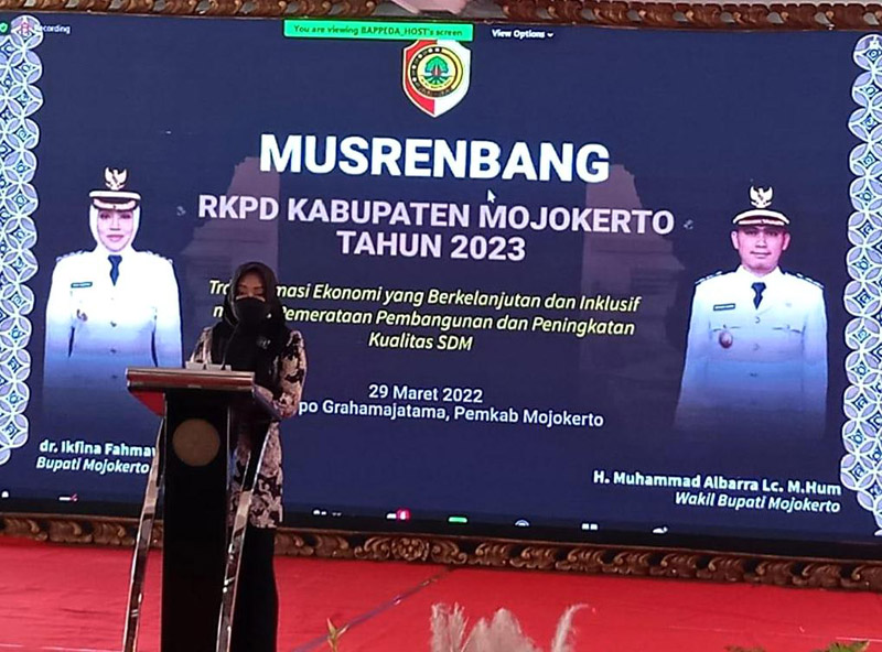 JATIMPOS.CO/KABUPATEN MOJOKERTO - Menyambut datangnya bulan suci Ramadhan 1443 H, Bupati Mojokerto Ikfina Fahmawati didampingi oleh Wakil Bupati Mojokerto Muhammad Albarraa bersama OPD di lingkup Pemerintah Kabupaten Mojokerto dan camat se-Kabupaten Mojokerto menggelar silahturahmi dan doa bersama di rumah dinas Bupati Mojokerto, Jumat (1/4/2022) pagi.