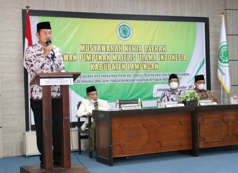 JATIMPOS.CO/LAMONGAN - Hadir secara langsung dalam Musyawarah Daerah Majelis Ulama Indonesia (MUI) Kabupaten Lamongan tahun 2021. Bupati Lamongan Yuhronur Efendi yang didampingi Wabup Abdul Rouf serta Ketua MUI Lamongan KH Abdul Aziz Choiri, mengajak MUI untuk membangkitkan ekonomi kemasyarakatan.